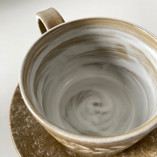 Handmade Wabi-Sabi Ceramic Cup and Saucer Set | Earth Tone with Hand-Painted Leaf Pattern