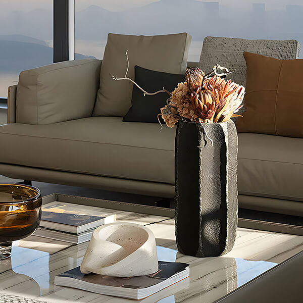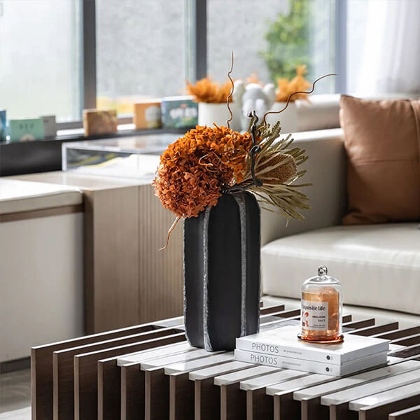 - Elegancia texturizada: la textura de cerámica negra agrega profundidad y carácter al jarrón, creando una pieza central visualmente atractiva y táctil para sus arreglos florales.